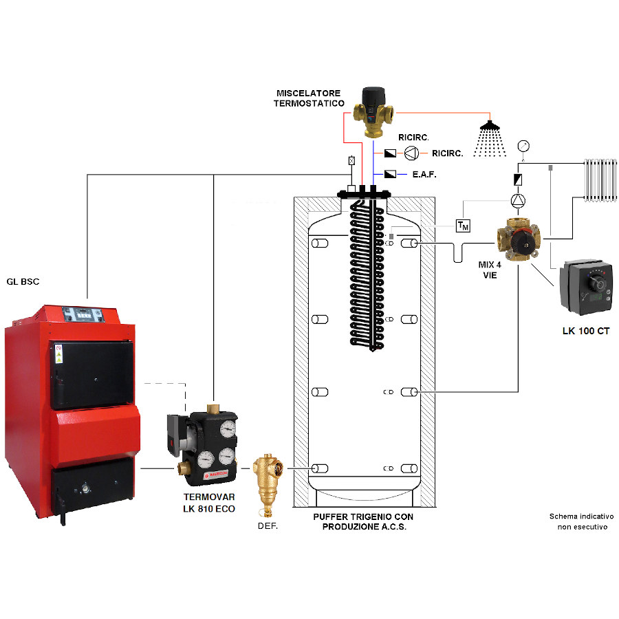 ● Combined buffer tank “TRIGENIO 1500” (1500 litres), ● drilled plate, ● copper exchanger 4.60 m2, ● thermostatic mixer “LK 551 Hydromix”, ● loading unit “TERMOVAR LK810 ECO 2.0”, ● 4-way mixer valve “MIX 4 – 1″”, ● heating controller “LK 100 CT”, ● dirt separator 1″ 1/4. |